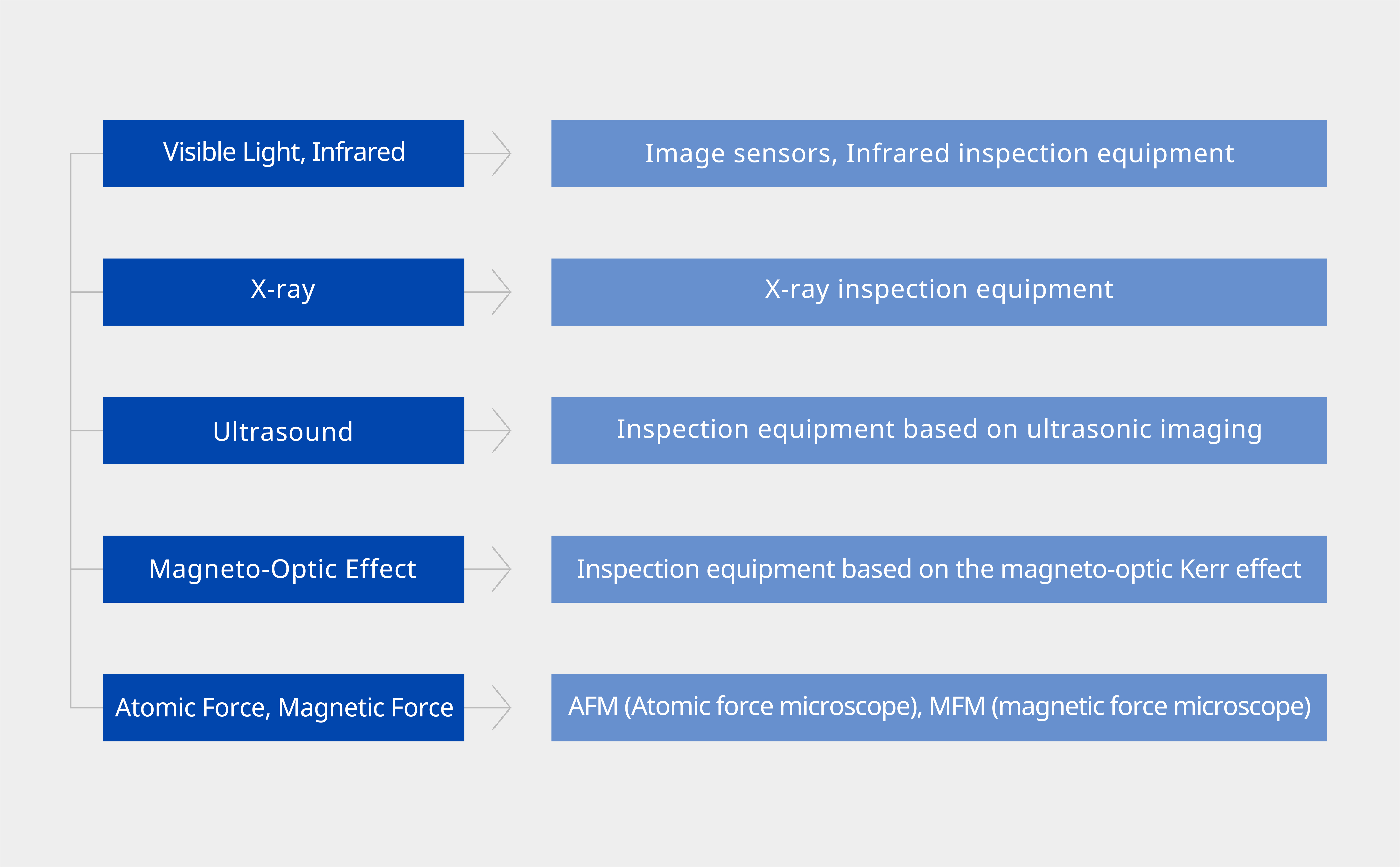 Inspection devices such as atomic force microscopes (AFMs) and magnetic force microscopes (MFMs) have a high spatial resolution in the order of tens to hundreds of nanometres. The scanning range is limited, however, and sensor sensitivity is low, and, as a result, they are not suitable for use for inspection on the production line, more for research purposes.