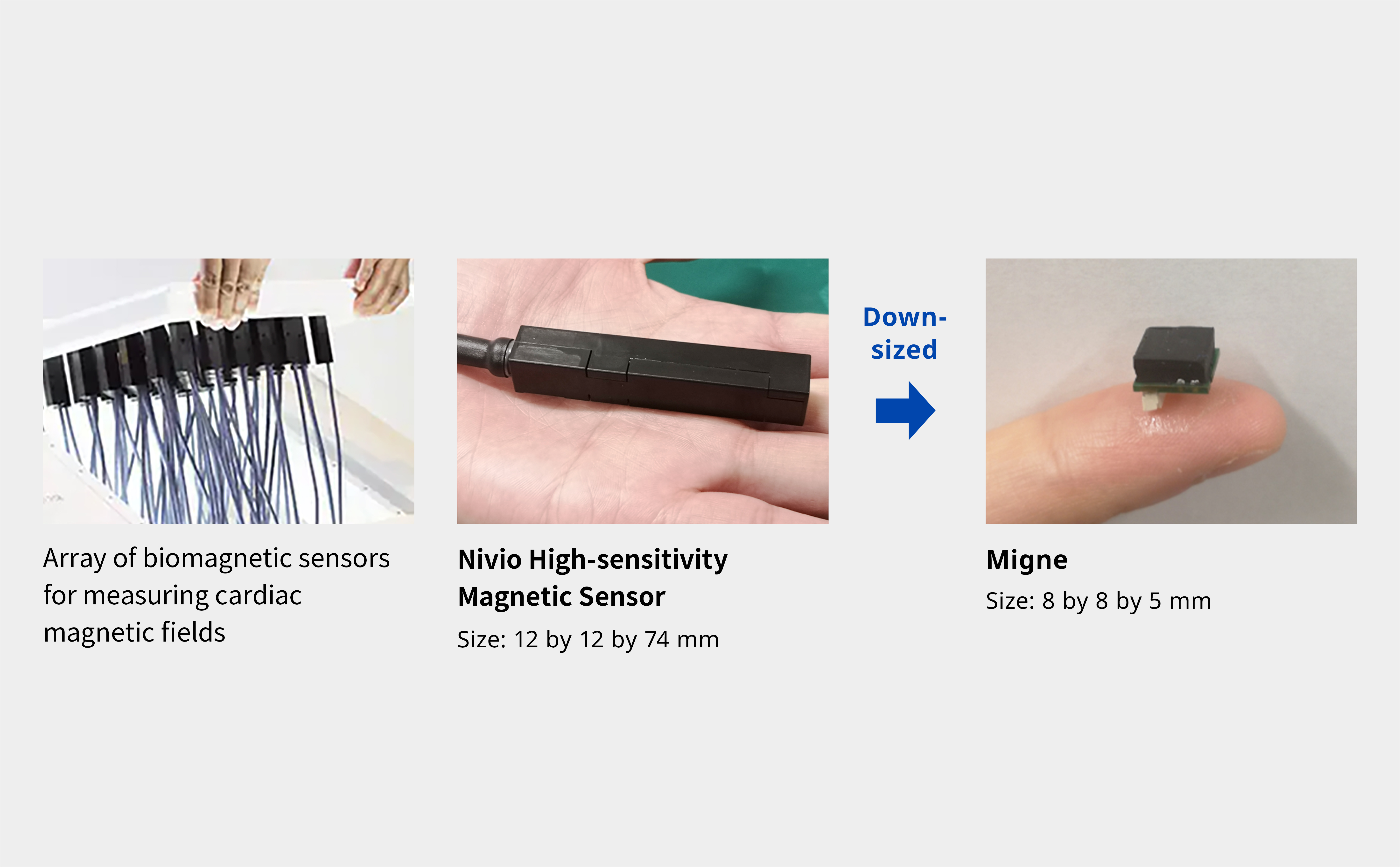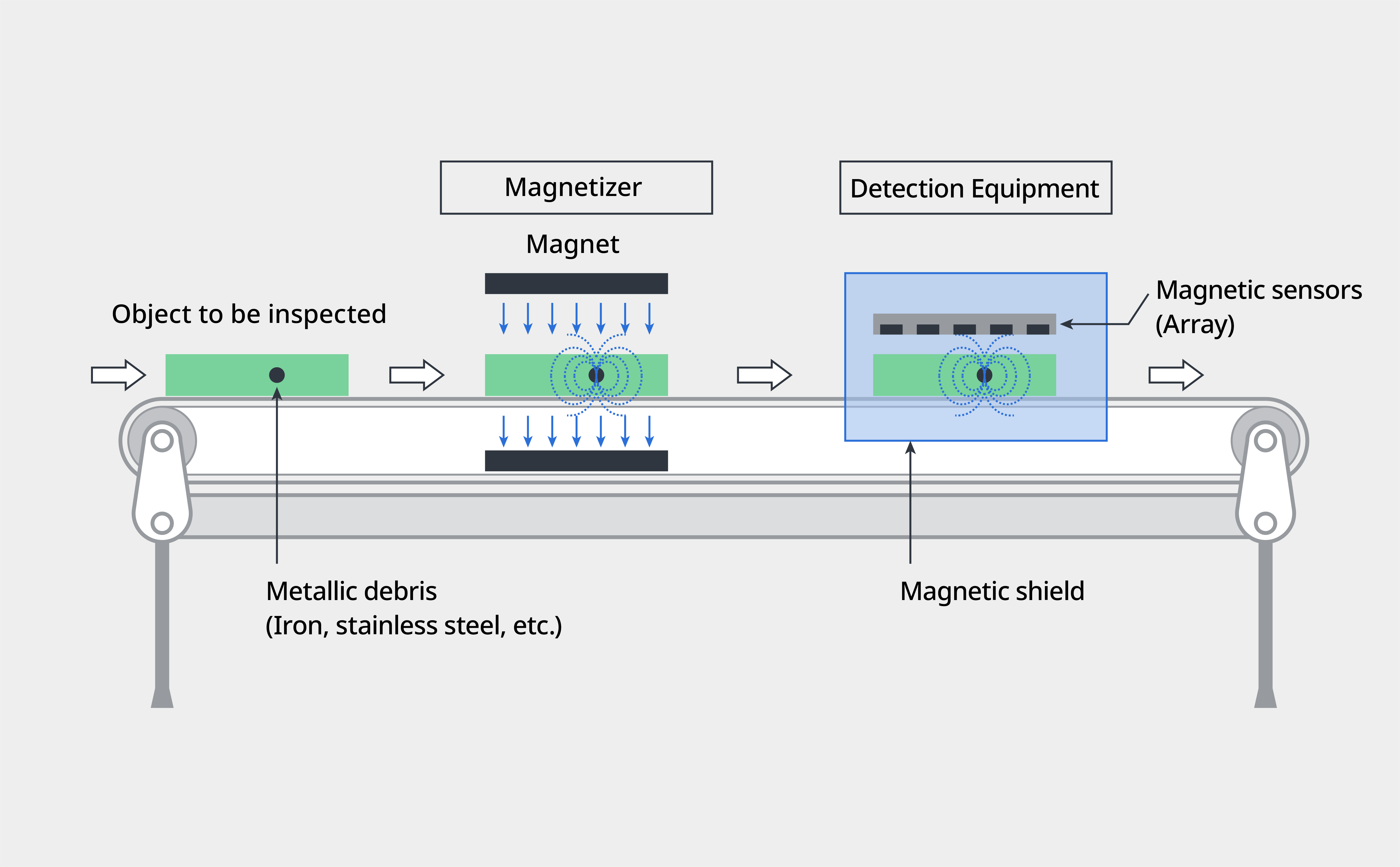 By arranging the Migne xMR sensors into an array, they can detect foreign objects over a wider area. Where sophisticated inspection for foreign objects is required, such as in the pharmaceutical and chemical industries, this technique can work in tandem with X-ray inspection systems and resolve the size detection limitation for finding tiny iron and stainless steel fragments. This method can also be used to reduce the risk of contamination by tiny metallic particles in electrode materials and separators for Li-ion batteries and fuel cells and many other products, increasing product safety, reliability, and lifespan.