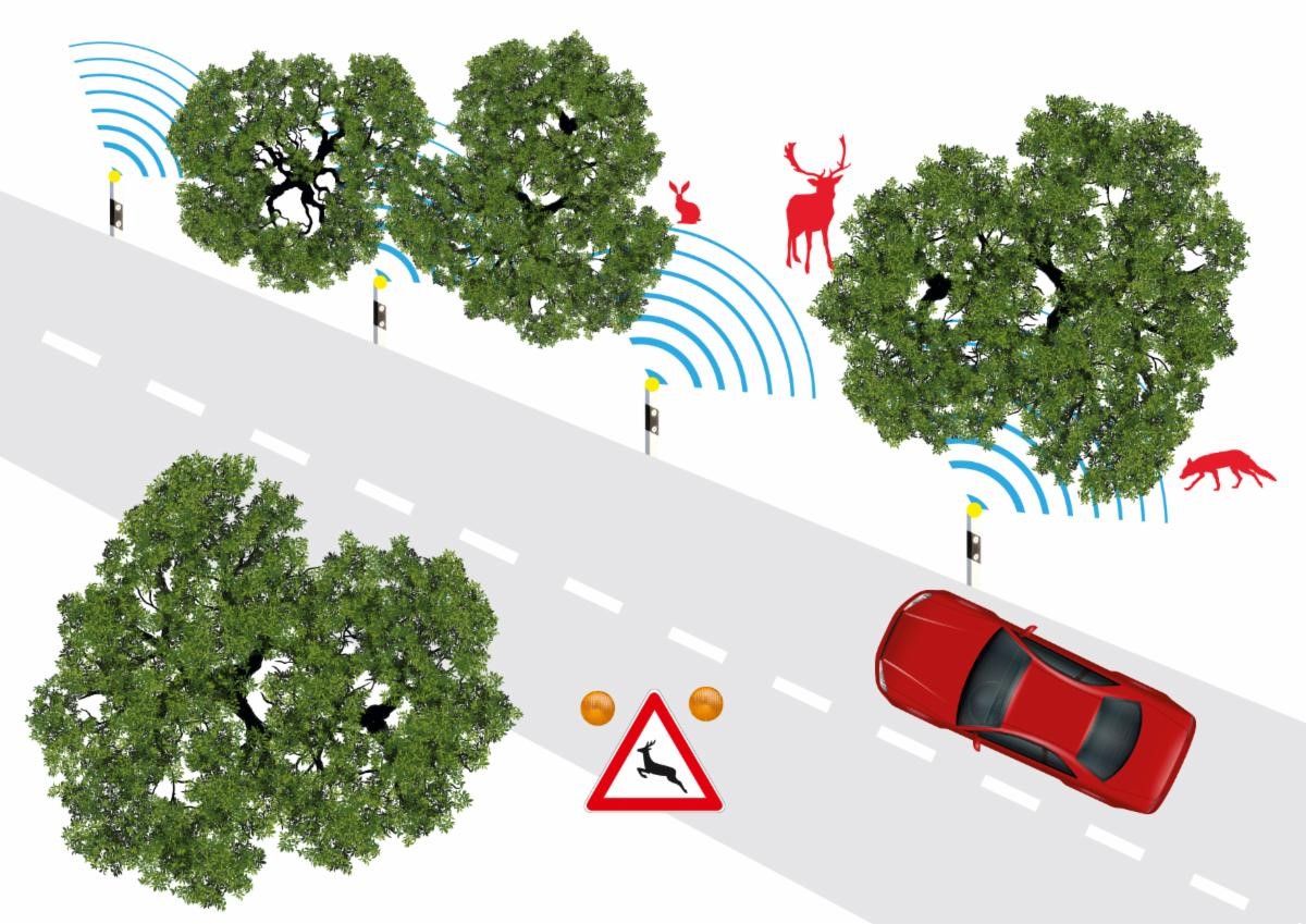 The project envisages widescale deployment of these self-contained units as posts beside roads across Germany, which means that they must be inexpensive and solar powered. The latter is particularly important for rural areas where mains electricity is not readily available and the need for such a warning system is greatest as street lighting is scarce.