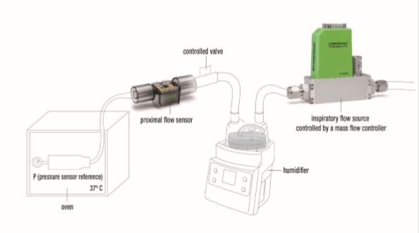 We demonstrated this in a simulated neonatal ventilator case with extremely humid air and a very small tidal volume of only 5ml. The schematic illustrated in shows a humidifier typically used in ventilator setups to ensure the breathing air is well humidified. The steel cylinder in the oven is kept at 37°C and simulates the lungs of the infant with the connected pressure sensor used as a reference. The controlled valve is closed during the inspiratory breathing cycle and opened once per second for the expiratory part of the breathing cycle.