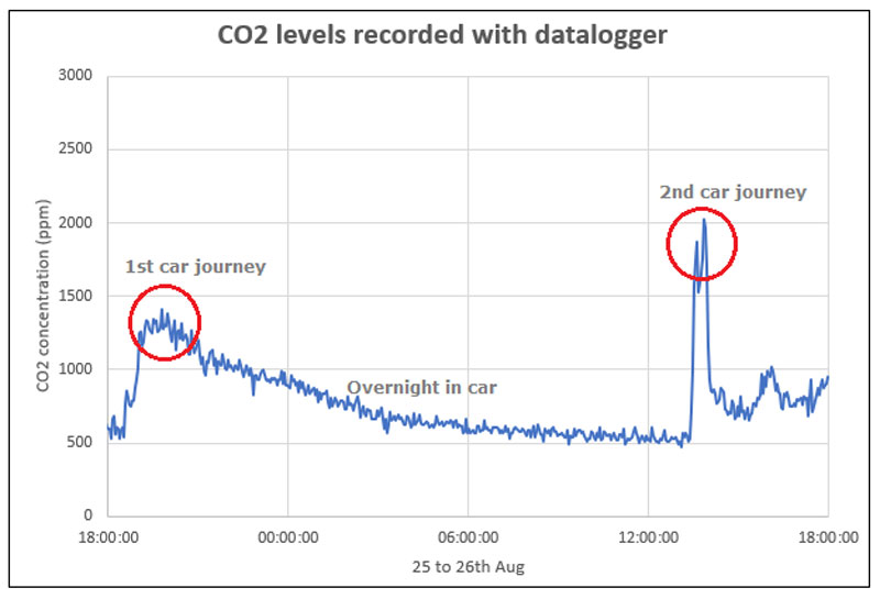 Next came the road trip. The first car journey involved two people travelling to the supermarket. The CO2 from their exhaled breath increased the concentration of CO2 in the car cabin to around 1,400ppm.