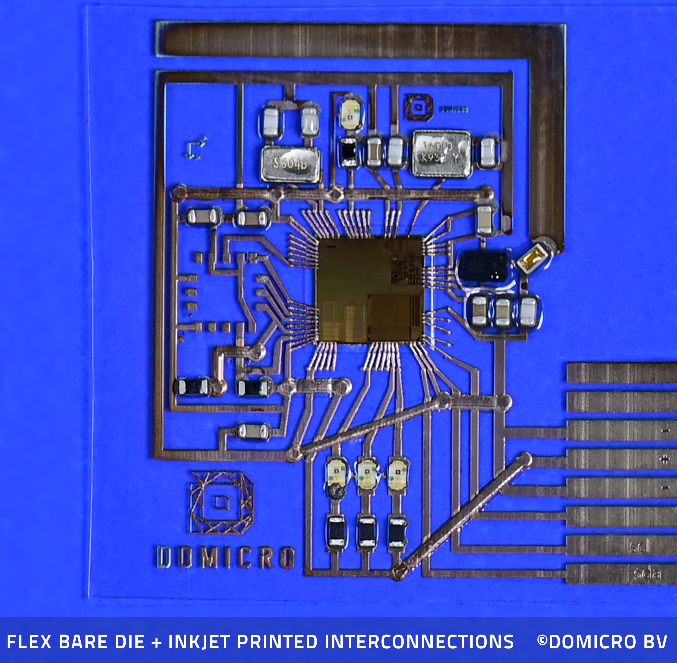 Using inkjet printing technology, DoMicro has developed a state-of-the-art approach for micro assembly of demonstrators for advanced applications with for example ICs, passive components, sensors, and LEDs. In previous work, DoMicro has worked on the integration of thinned bare dies using the inkjet printed wire bond interconnection method. The technology for integrating dies is one of the key enablers for the realization of new applications in flexible hybrid electronics (FHE), e.g., in in-mould electronics or smart glass.