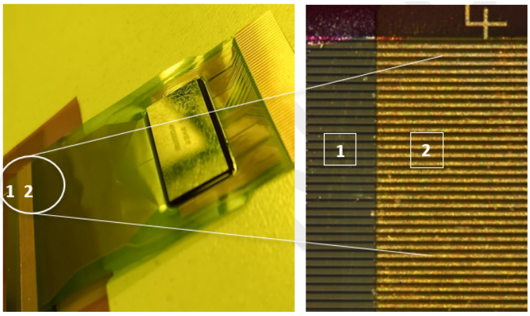 Figure 3. Sensor (1) and the COF (2) on top. Right image shows the alignment of the sensor pixels with the COF contacts at 100µm pitch.