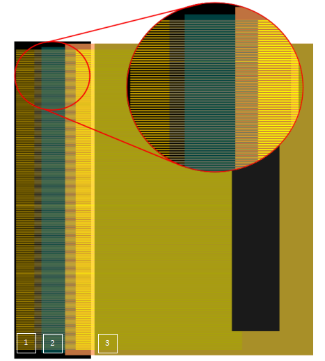Figure 4. Schematic representation of the printed interconnections between the sensor pixels and the COF contacts. 1: Sensor 2: Ramp 3: Read-out electronics COF