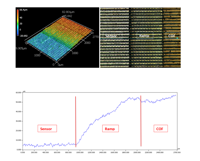 Figure 5. Top left: 3D image of the printed interconnection. Top right: microscope image of the printed traces on the sensor, ramp, and COF contacts. Bottom: height profile of the silver traces (average of the blue lines in the top right image)