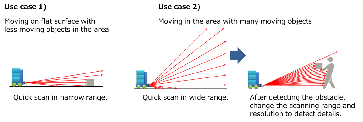 Autonomous robots are required to detect the objects in the specified area. For example, autonomous robots do not need to sense the objects in details when they move on flat surface with less objects in the area. The object detection sensor can be scanned at relatively high speed according to the robot’s speed. On the other hand, in an area with many moving people or objects, it requires high sensing technologies with a wide angle of view. Furthermore, the sensor needs to examine the details of the object’s surface that has been detected. Panasonic’s new 3D LiDAR can easily vary the detection settings thanks to its unique laser-scanning technologies employed. Stable and time-effective operations of autonomous robots can be achieved by choosing the most suitable detection settings depending on the conditions of the areas where they will be used.