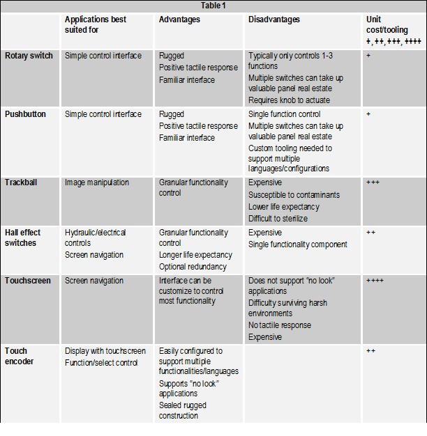 Designers face a myriad of options for equipment and device user interface and each one has its place in today’s designs. Table 1 is a quick overview comparing available options.