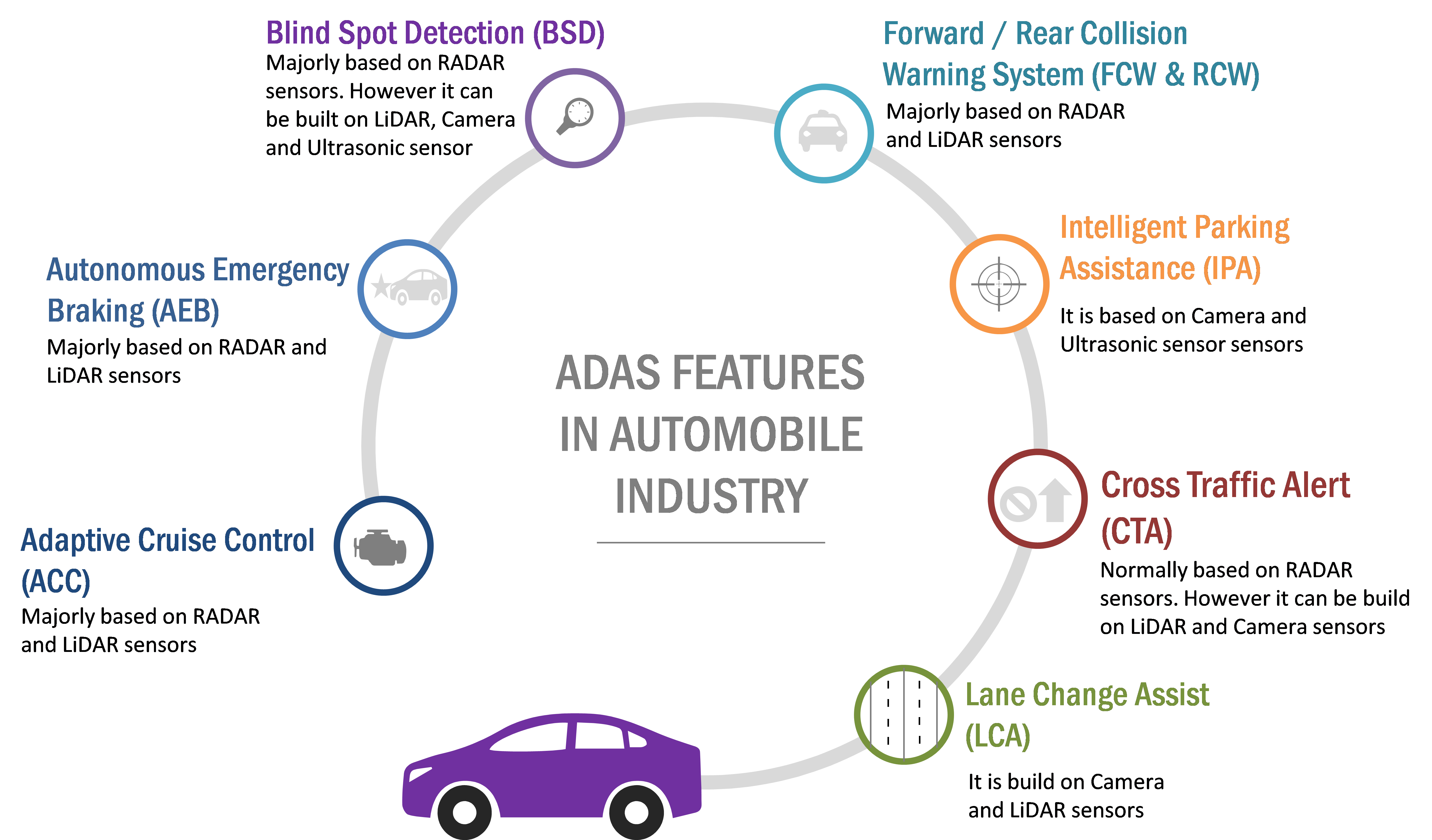 The automotive LiDAR and RADAR based features play a preventive role in mitigating crashes and accidents by providing advance warning or additional assistance in steering/controlling the vehicle. Following are the ADAS features using automotive LiDAR and RADAR sensors: