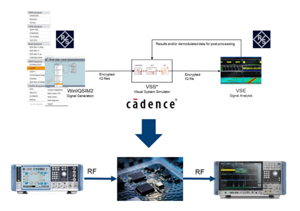 The package contains software equivalents with the signal generation software (R&S WinIQSIM2 simulation software) and vector signal explorer (R&SVSE) as plugins for Cadence Visual System Simulator (VSS) software. The VSS software environment for system simulation and modelling is part of the Cadence AWR Design Environment platform. It is particularly suited to developing RF components and RF assemblies used in wireless communications and radar design.