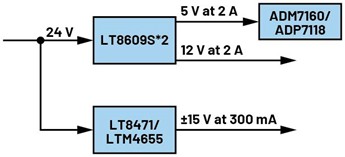 Both the LT8471 and the LTM4655 are dual outputs with positive and negative voltages. The LTM4655 with included controllers, power MOSFETs, inductors, and filters in the signal chain is designed to reduce design complexity while having a good EMI immunity.