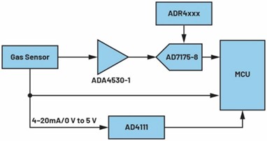 After converting the current signal into a voltage signal, the AD7175 a 24-bit, 8-/16-channel, 250kSPS, sigma-delta ADC, is used to get accurate results. 4–20mA signal sampling: the AD4111 ADC is a good choice for sampling the air sensor outputs transmitted by 4–20mA signal, as it has extremely good channel matching due to the integrated sense resistors for the current and voltage sampling. The device is a low power, low noise, 24-bit, sigma-delta ADC that integrates an analogue front end (AFE) for fully differential or single-ended, high impedance (≥1M) bipolar, ±10V voltage inputs, and 0mA to 20mA current inputs. This ADC also integrates key analogue and digital signal conditioning blocks to configure eight individual setups for each analogue input channel in use.