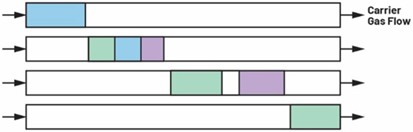 The carrier gas of gas chromatography is the mobile phase, and the sample under test is named stationary phase including solid and liquid mixture. The stationary phase is separated with gas flowing movement to leave the chromatographic column in sequence. Afterward, it enters the detector and generates the ion flow signal. These small signals are reflected to different components of the chromatogram by amplifying to a suitable amplitude on a recorder. The separation process from the mixture to two individual samples is shown in Figure 2. Green and purple colours stand for two different samples, and blue colour stands for mixture.