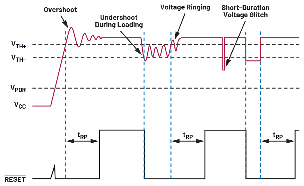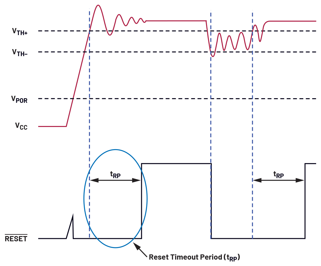 During startup or when the supply voltage is rising up from an undervoltage event and exceeds the threshold, there is an additional time on the reset signal before it deasserts, which is called the reset timeout period (tRP). As an example, Figure 3 shows that after the monitored voltage, which in this case is the supply voltage labeled as VCC, reaches the threshold from an undervoltage or startup, an added delay is present for an active LOW reset before it deasserts HIGH. This additional time gives room for the monitored voltage to stabilise first, masking the overshoot and ringing before enabling the system or taking it out of reset mode. The reset timeout period suppresses false system resets to prevent oscillation and potential malfunction, thus helping improve the reliability of the system.
