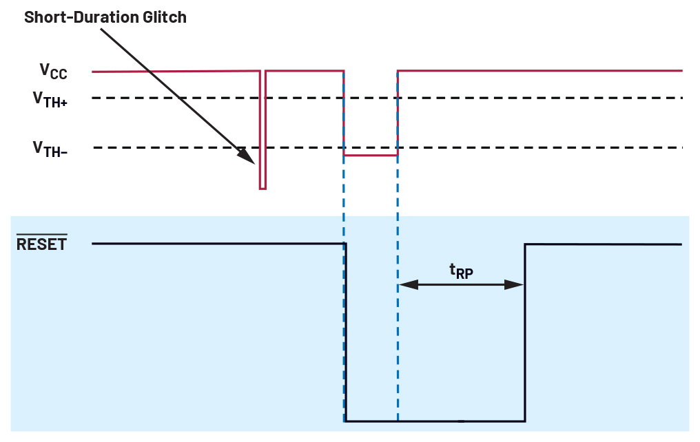 Voltage glitches from external factors can occur in any system for either short or long periods. They can also have different magnitudes of voltage dip. Reset threshold overdrive vs. transient duration has something to do with the magnitude and duration of the voltage glitch or overdrive. A short-duration glitch with a greater magnitude will not trigger a reset signal to assert, while a less-magnitude overdrive with a longer duration will trigger a reset as shown in Figure 5.