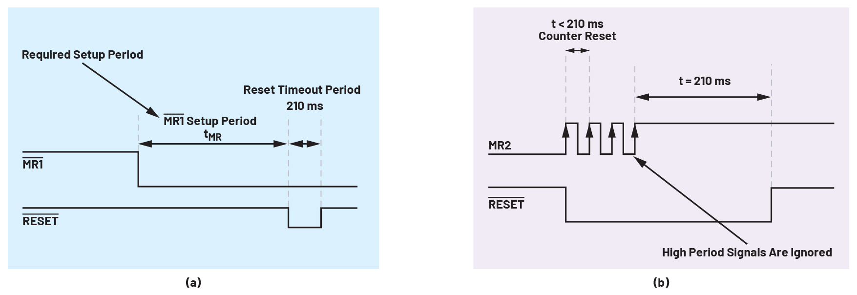 Figure 7. The manual reset setup period and debounce time diagram of a supervisor with a long manual reset setup period (MAX6444): (a) the manual reset setup period (tMR) needs to be completed first before a reset signal asserts; (b) to be considered as a valid input signal, debounce time (tDB) is required to be completed