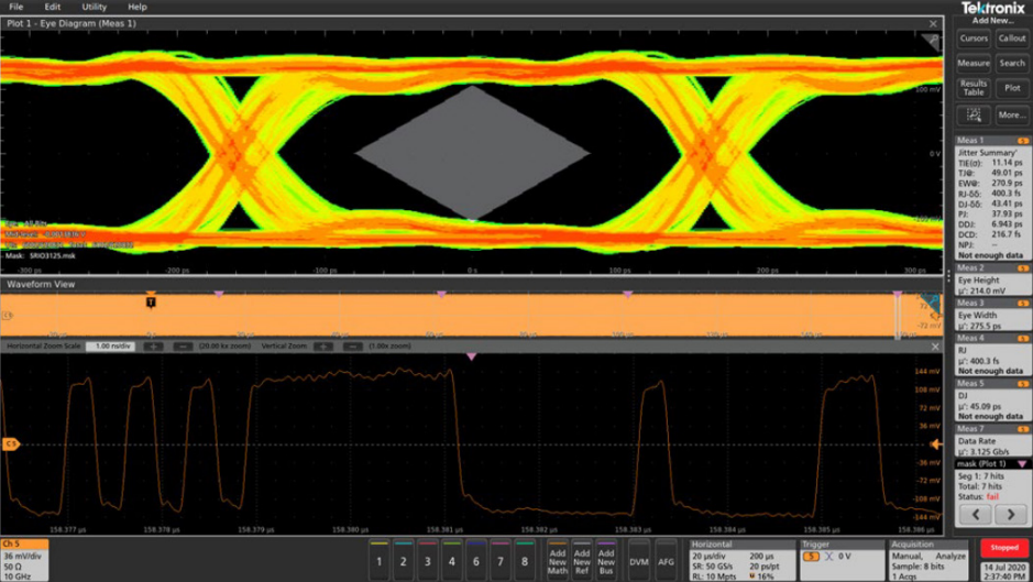 Figure 1. Eye diagram with mask test, top, and corresponding waveform, bottom.