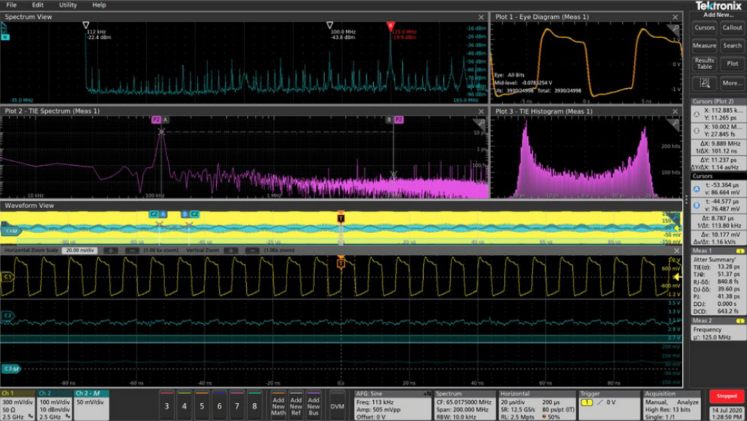 Jitter and power are analysed in both the time and frequency domains. Comparing PJ (periodic jitter) frequencies in the TIE spectrum to spurs in the power ripple spectrum is a fast and accurate way to identify signal integrity problems caused by the power distribution network (PDN). Jitter is measured relative to the system clock. Systems that use embedded clocking, where the clock is recovered from data transitions, mitigate low-frequency jitter but must be analysed with an oscilloscope capable of emulating the precise clock recovery scheme.