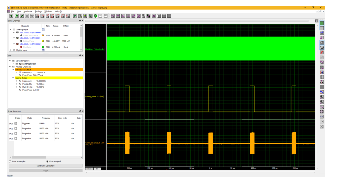 The DPG pulse is used as a gate signal (centre trace) to on and off key a 1GHz RF carrier (top trace) with an external RF switch circuit to generate a pulsed radar signal (bottom trace). This produces a pulse repetition frequency of 10kHz and a 10% duty cycle. The pulse generator setup in SBench6 for this gating signal is shown in the Pulse Generator window in the bottom left of the display. Settings for frequency, duty cycle, delay, trigger mode, and loop count define the generated pulse. Measurements of both the DPG output and the gated RF pulse are displayed in the Info window (above the Pulse Generator window). The pulse peak-to-peak amplitude, frequency, width, and duty cycle are shown along with the amplitude of the gated pulse output and the frequency of the RF carrier. The signals are displayed in a common grid of the spread display type for visual comparison.