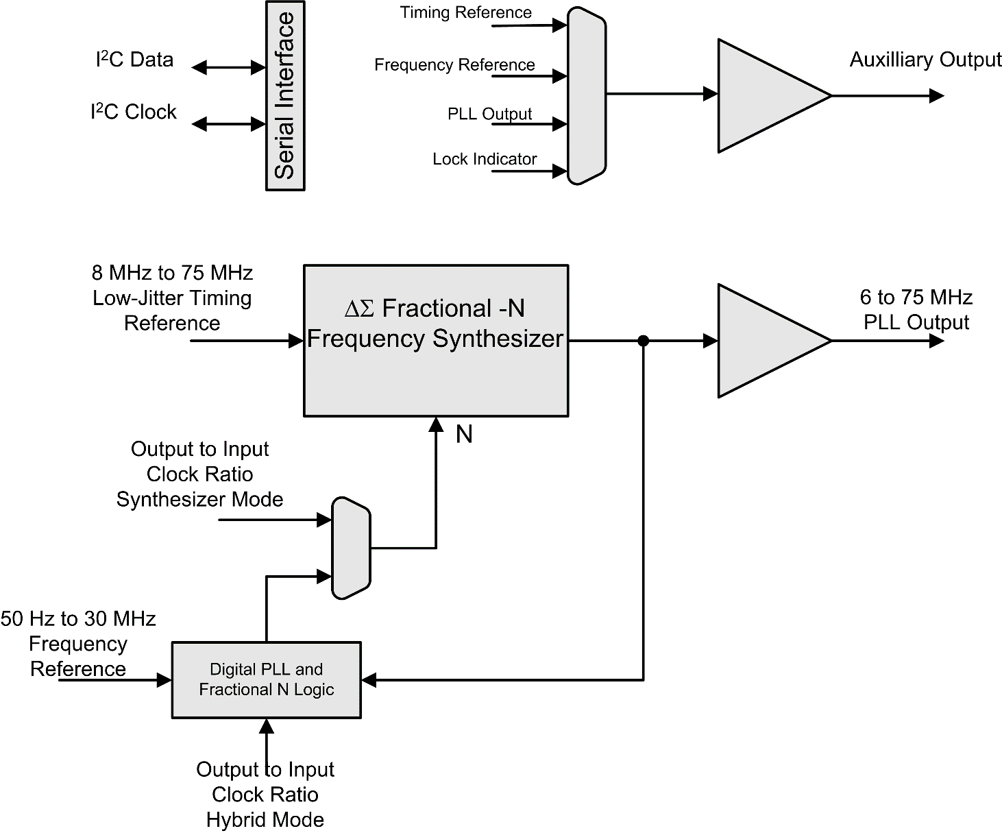 This is basically an analogue circuit which is controlled by the contents of digital registers. It also provides an option to use an internal digital PLL to create a hybrid synthesiser. The register data content is entered via a digital serial interface, in this case an Inter-Integrated circuit or I2C. Additionally, the auxiliary output provides access to other digital signals like the PLL lock indicator. Testing this frequency synthesiser would benefit from a mixed mode measurement instrument.