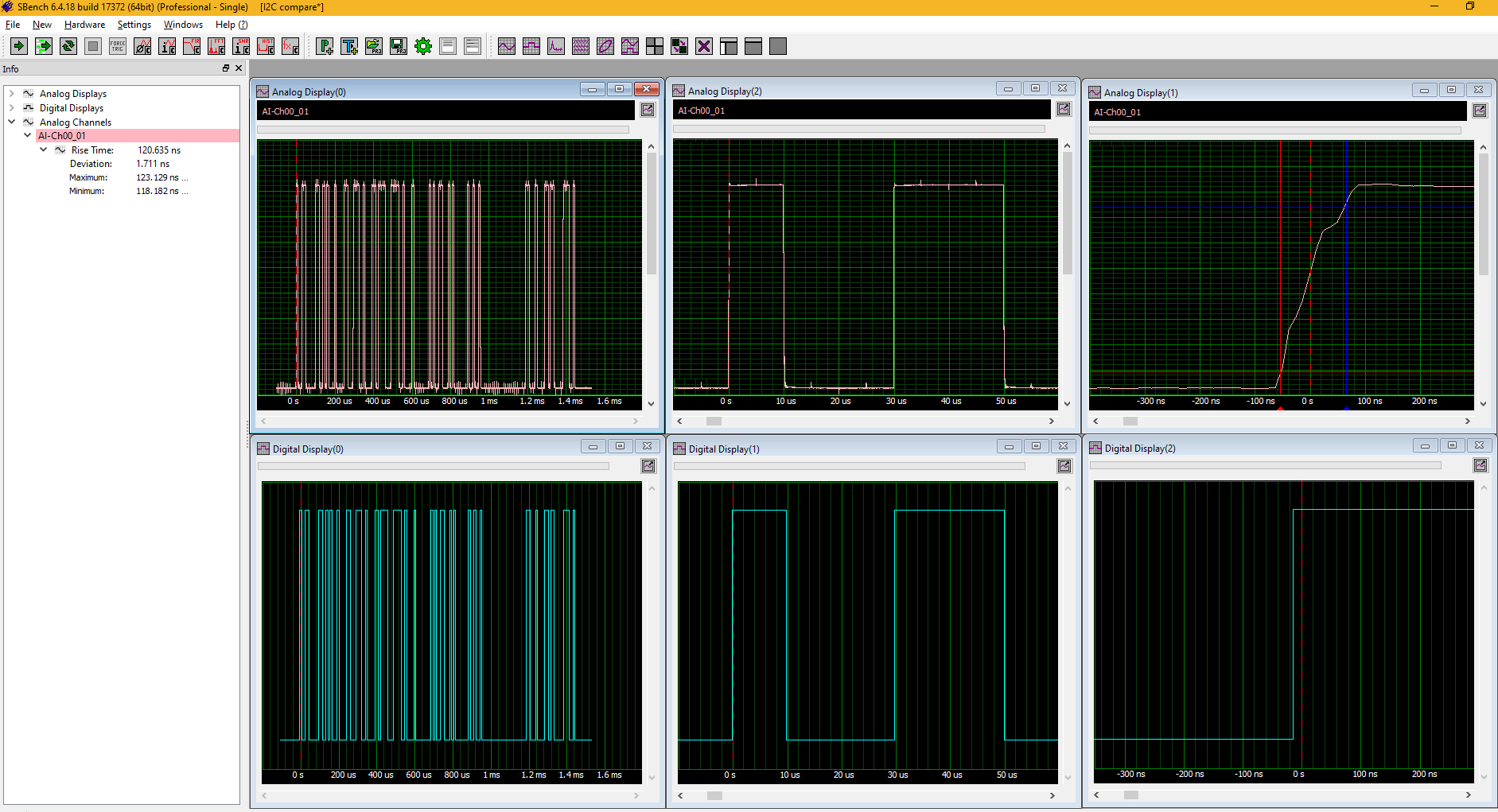 The analogue and digital versions of the I2C data signal are compared using Spectrum Instrumentation’s SBench6 control and signal processing software. SBench 6 is a very handy tool for operating the digitiser and displaying and analysing the acquired data.