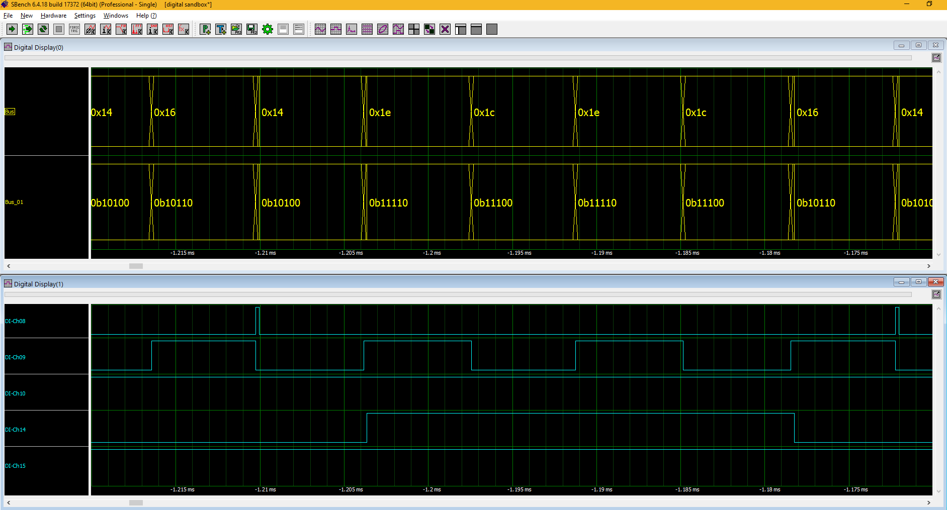 Digital information in SBench 6 can be displayed in two forms. The digital waveforms can be displayed individually in a line view, sometimes called a ladder display, or bundled as a bus view; examples of both views are shown in Figure 4.