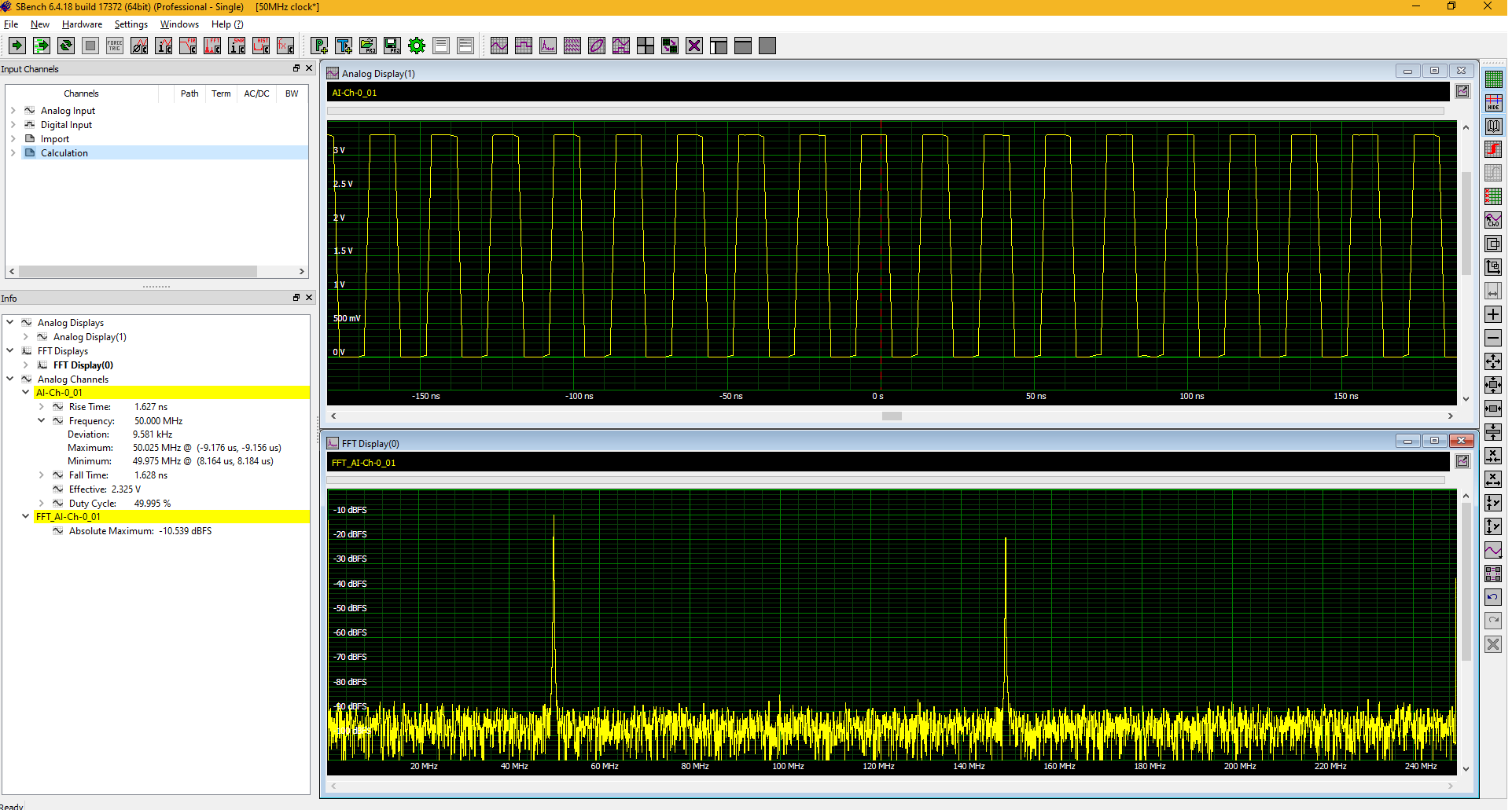 Current practice is to pass up to the fifth harmonic. For a 50MHz rectangular square wave clock would require a measurement bandwidth of 250MHz. Figure 5 shows the acquisition and measurement of the 50MHz square wave clock, again using SBench 6.