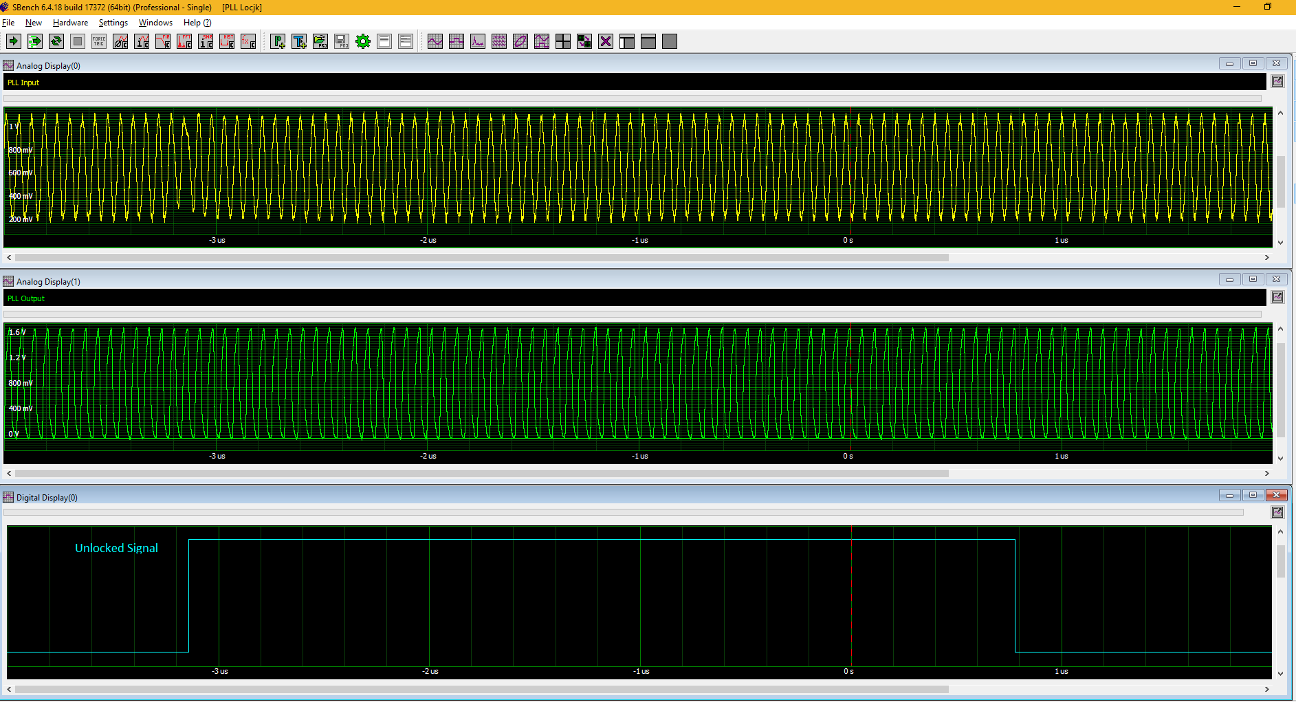 Figure 6: Combining the analogue input (top)and output (middle)waveforms of a PLL with the digital “unlocked” indicator signal(bottom) it shows the cause of the unlocked condition.