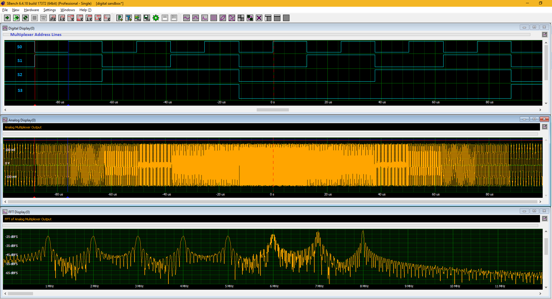 Figure 7: The digital address lines in the top grid select which input is connected to the output. The output signal is in the centre grid. The FFT of the output shows that there are eight distinct input frequencies from one to eight MHz.