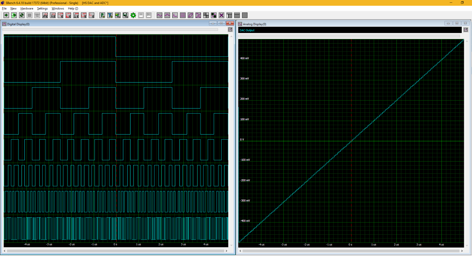 Figure 8: A mixed signal digitiser can see both the digital input (left grid) and output (right grid) of an 8-bit offset DAC