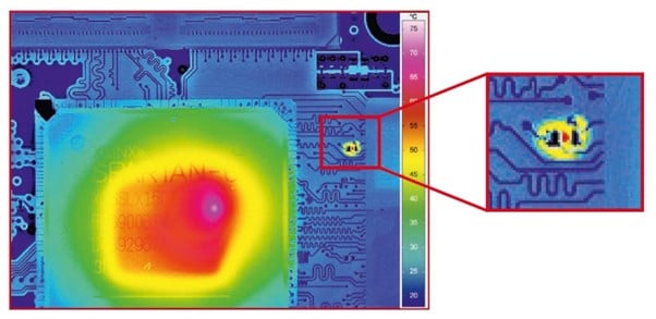 Thermographic inspection with infrared cameras enables non-contact, real-time analysis of electronic systems for failure detection, thermal design validation, and quality assurance. It helps engineers identify hotspots caused by contact resistance, cable constrictions, hidden cracks, soldering defects, and even short circuits within multilayer boards. The technology also reveals power losses from high-frequency mismatch and supports evaluation of cooling concepts, heat sink connections, and board layouts to reduce component aging. Beyond diagnostics, thermography is used to assess service life under load cycles and troubleshoot power electronics such as inverters and charging stations. A newer application is the detection of thermally active watermarks, which can expose unauthorised hardware changes or malicious modifications by tracking a chip’s thermal fingerprint.