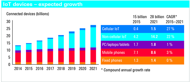 Currently more headline than reality, the Internet of Things (IoT) will soon permeate everyday life through home automation, wearables and connected car technology. It will ultimately have a far greater impact than smartphones do today. An increasing number of devices are being designed with integrated wireless modules in order to exchange (often sensitive) data, transmit measured values and remotely control systems. The number of ‘things’ communicating via the internet is expected to increase drastically over the coming years, with a major surge predicted after 2020 when 5G provides the necessary network resources (Figure 1).