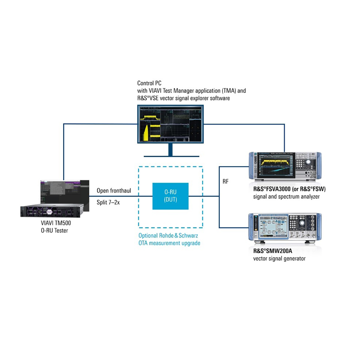 - The R&S SMW200A vector signal generator, R&S FSVA3000 signal and spectrum analyser and the R&S VSE signal analysis software from Rohde & Schwarz, to emulate a real-world radio environment by generating, capturing and analysing RF signals, extended for O-RAN applications.