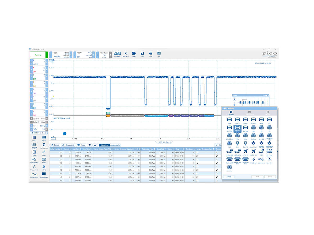 The PicoScope SENT SPC decoder meets the growing demands of automotive engineers and technicians to debug and validate the operational performance of their automotive designs. The decoder builds on proven PicoScope 7 capabilities, such as its user-friendly and intuitive interface, allowing automotive professionals to quickly identify and resolve communication issues within electronic control systems. The new decoder is fully compatible with all real-time PicoScopes, from the 2000 through to the high-performance 6000E Series instruments, enabling users to integrate this valuable tool into their existing setups without the need for additional hardware.