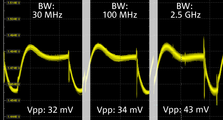 Figure 3: Peak-to-peak voltage measurements using the RTP oscilloscope and RT-ZPR40 power rail probe show the impact of bandwidth-limiting at three different values. The 2.5 GHz bandwidth setting visually shows coupled signals that are attenuated and are missed with lower bandwidth limit settings.