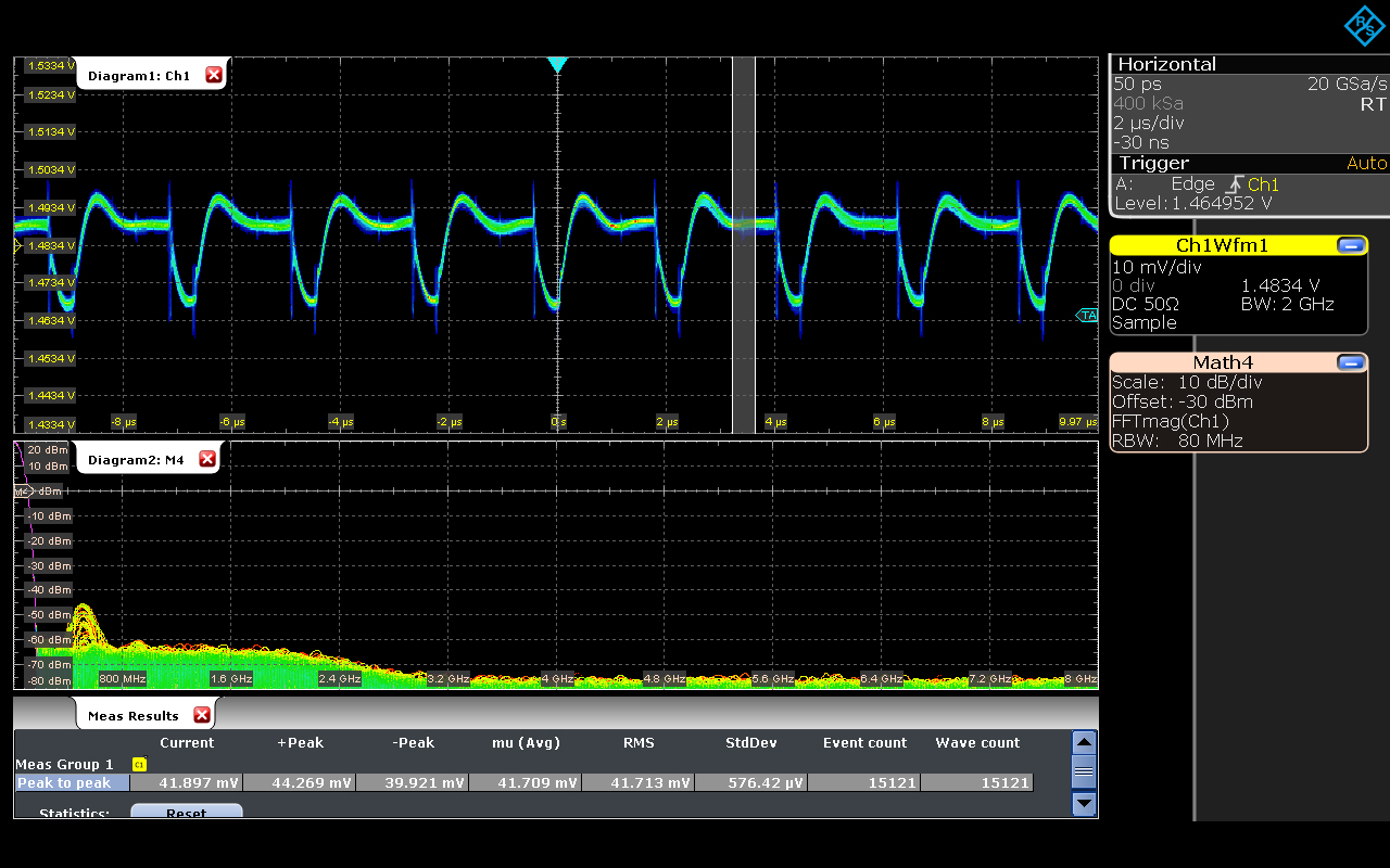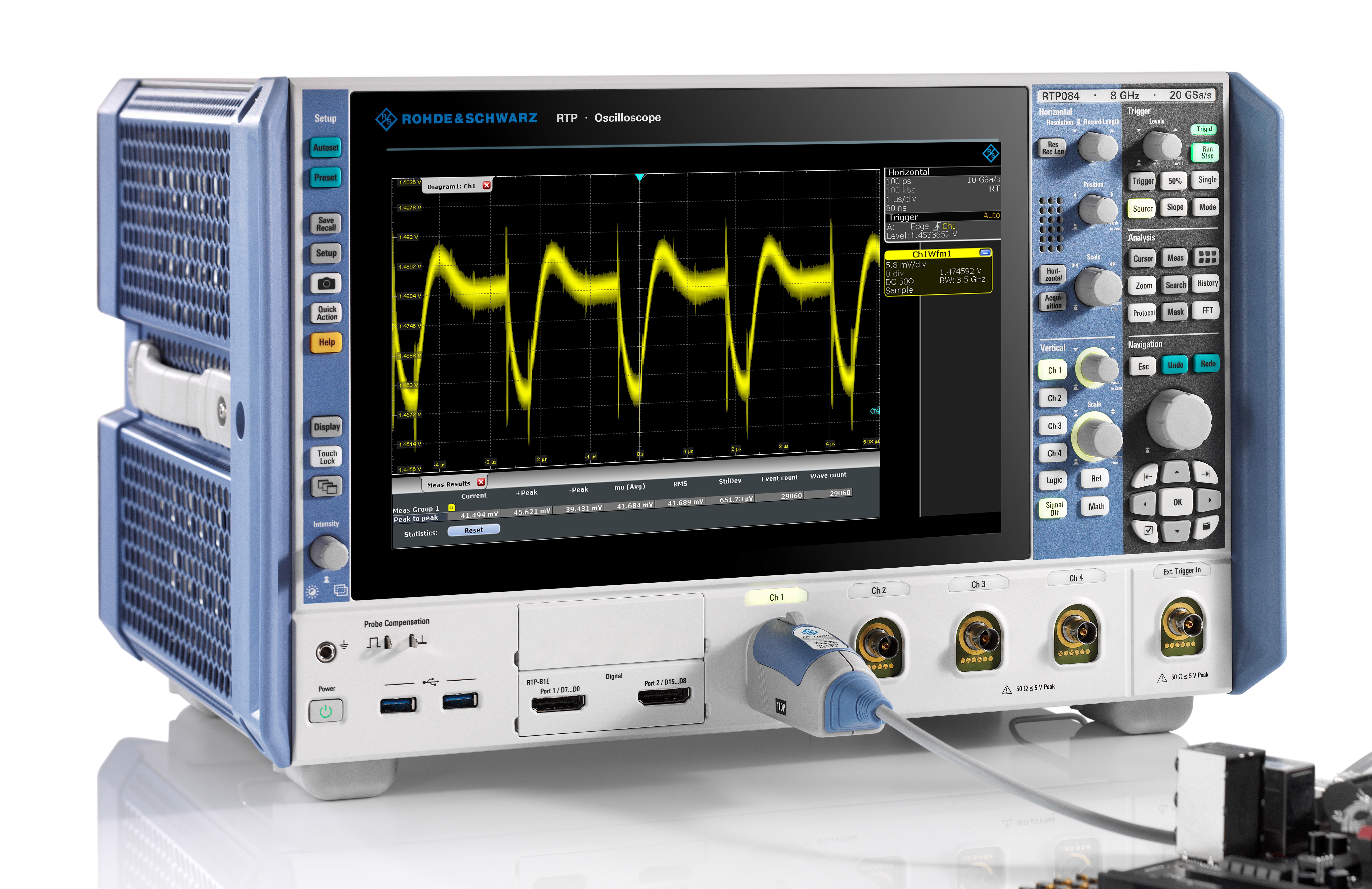 Figure 1: Low-noise, high-bandwidth scopes like the 8GHz RTP from Rohde & Schwarz, characterise DC rails. Probes, such as the 4GHz RT-ZPR40, are designed specifically for power rail measurements