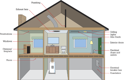 Significant air leaks tend to occur near attics and basements due to the stack effect. The stack effect occurs when warm air rising in a home creates an area of low pressure at the lower levels and high pressure near the roof. These pressure differences force warm air to escape from the top and cold air to enter near the bottom. Other common areas of air leakage are highlighted in Figure 3.