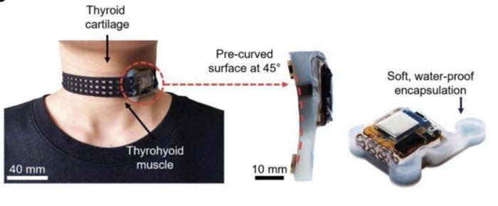 The sensor module, positioned on the thyrohyoid muscle, features a 45-degree pre-curved design and soft, waterproof encapsulation. Credit: Park et al