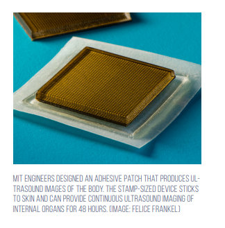 It is a small patch, measuring 2cm2 x 3mm deep (approximately the size of a postage stamp), and it is made up of two thin layers of elastomer that surround a middle section of solid hydrogel. The bottom layer of elastomer sticks to the skin, and the top layer has a rigid display of transducers that the MIT engineers both designed and fabricated.