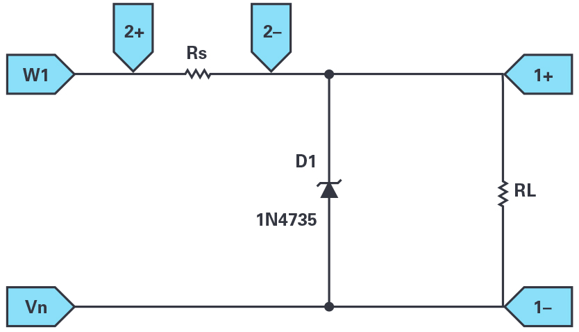 A voltage regulator is a circuit used to maintain a constant output voltage at a load independent of changes in the load current. For example, the load could be a microcontroller-based system that requires a constant supply voltage even as its demand for current varies with system activity. The Zener diode regulator in Figure 1 offers a very simplified way to maintain the load voltage, VL, at the same value as the reverse breakdown voltage of the Zener diode, provided that the load resistance, RL, remains higher than some lower limit. The voltage source, VIN, and resistor, RS, model the Thévenin resistance of a possible circuit that has converted a high voltage such as the 120V ac mains power to an unregulated and unfiltered lower dc voltage source