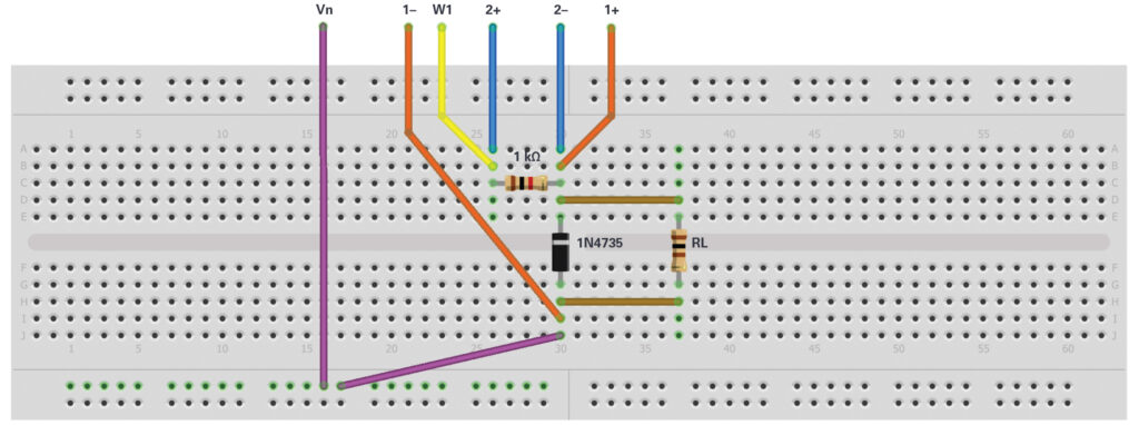 Build the circuit shown in Figure 1 on your solderless breadboard using the 1N4735 6.2V Zener diode. Use AWG1 (5V constant) and the –5V Vn user supply to establish the dc supply VIN. Use various fixed and variable resistors for RL.