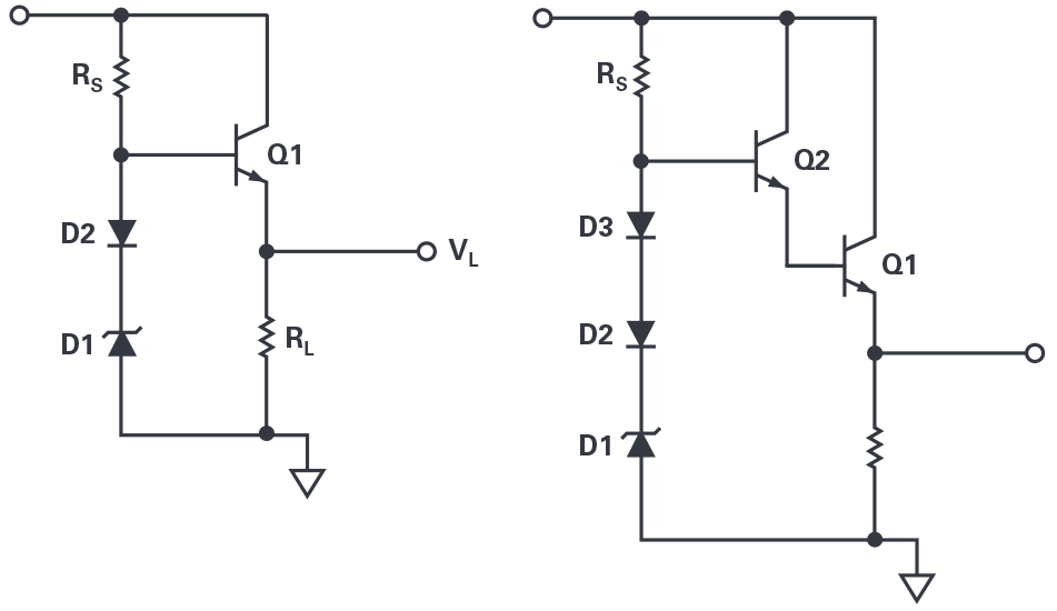 Build either of the circuits shown in Figure 2 on your solderless breadboard using the 1N4735 6.2V Zener diode as D1 and a 2N3904 or TIP31 power transistor for Q1. Q2 can be a 2N3904 and D2, D3 can be a 1N914.
