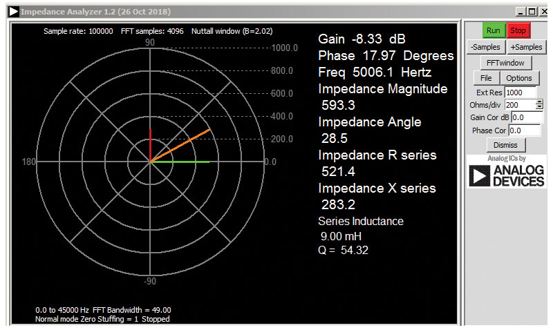 4. Vary the frequency below fo in steps of 100Hz and take up to three measurement readings from the impedance Record the readings in Table 1. Repeat the same by varying the frequency above fo in steps of 100Hz. Carefully observe the rotation of the magnitude phasor (orange line)