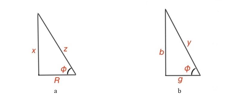 Here the z parameter is a hypotenuse, and are the sides of the triangle. The resistance triangle shows the relation between the active and reactive resistances. So active and reactive conductances are also related to each other with the triangle model, .