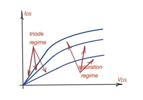 Figure 1. The transverse characteristic of MOSFET operation. There are three lines depicted that are the focus of the .