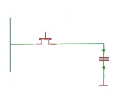 Dynamic RAM (DRAM) is a more cost effective type of RAM, where transistors and invertors are replaced with the capacitor as shown in Figure 3. DRAM architecture is depicted in Figure 4. It is structured as a matrix of bits with rows and columns, which determines the data adress. Rows and columns are multi–plexed onto the same pins. Row addresses are loaded and stored in the RAS (raw adress stobe). Column addresses are loaded and stored in the CAS (colums address strobe).