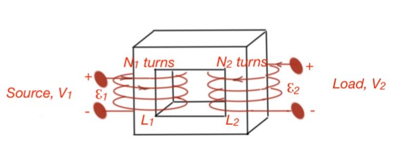 Transformers are most frequent nowadays in the magnetic structures that are in use in many devices. The ideal transformer is a device that sets the AC voltage up or down with an exact coefficient. The ideal transformer is depicted below. The magnetic flux is concentrated in the core, and that flux links all turns of the coils, and permeability of the transformer is infinite.