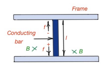 Specifically, potential difference will appear on the conducting bar, as positive and negative charges are oppositely directed. This potential difference is the EMF, that is equal to the magnetic field force acting on the charges. So ε=Blv.