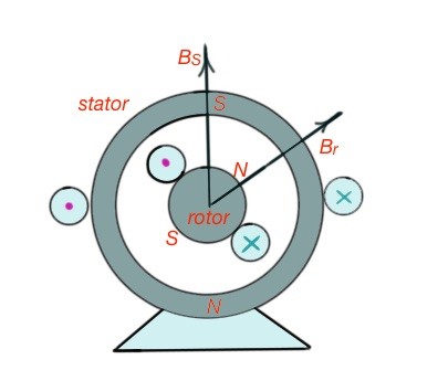 Let’s consider physics that occur in electrical machines. In all electric machines the force on the wire is , where – is the current through the wire, and is the magnetic field. The torque at a minimum on the coil is , here the is the coefficient, depending on the geometry of the coils, is the angle between the magnetic field and the current. There are two fields that are generated – in the stator and rotor. The stator magnetic field generates the magnetic field that is described with the following formula: .
