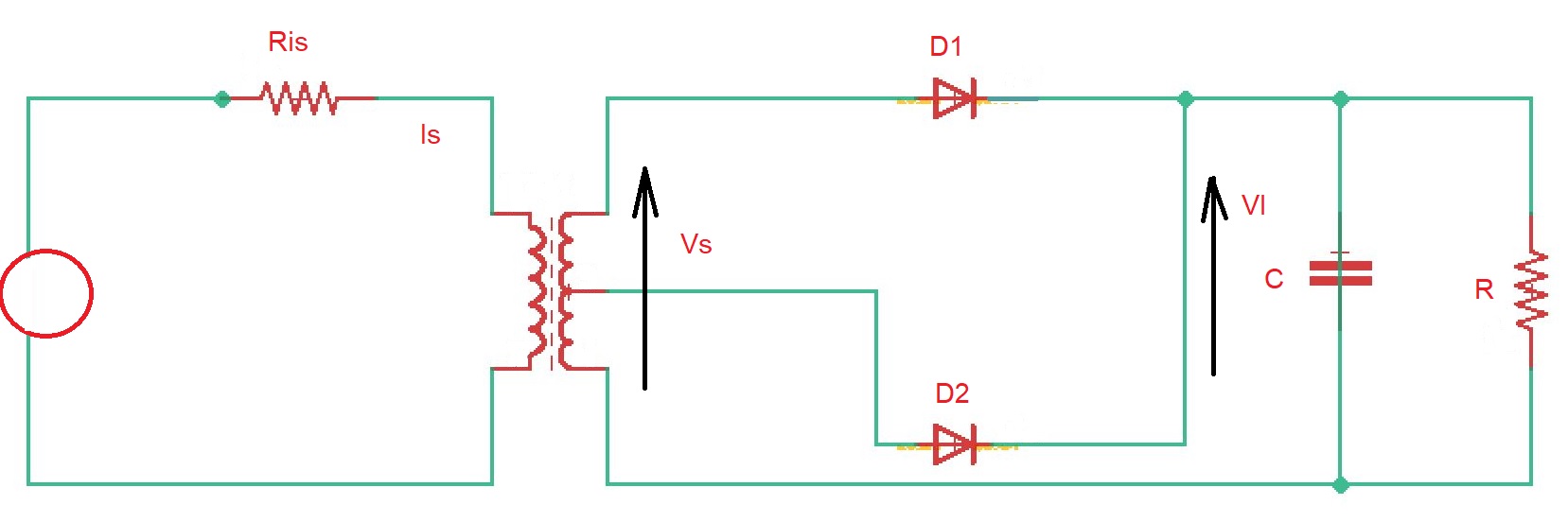 Here . resistor used to limit the input-surge current when the rectifier is connected to power supply. When the voltage is higher than voltage , diodes and conducts, capacitor is charging. When the voltage of secondary winding of transformer is lower than , diodes and reverse biased, capacitor is discharged. The average value of capacitor voltage , is peak-to-peak ripple voltage .