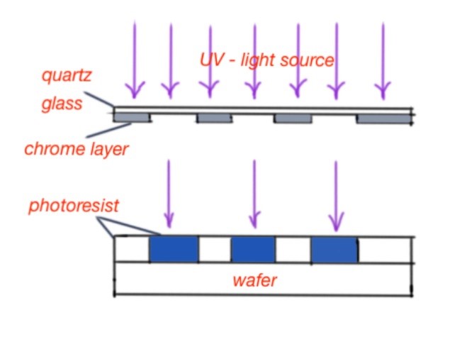 At first the wafer is covered or coated with photoresist, which can disappear under certain conditions. The next step is to use a photomask (Figure 1). The photomask is a quartz glass, with applied chromium material with a certain pattern. The photoresist is exposed by an applied UV source, where the mask is not covered by chrome.